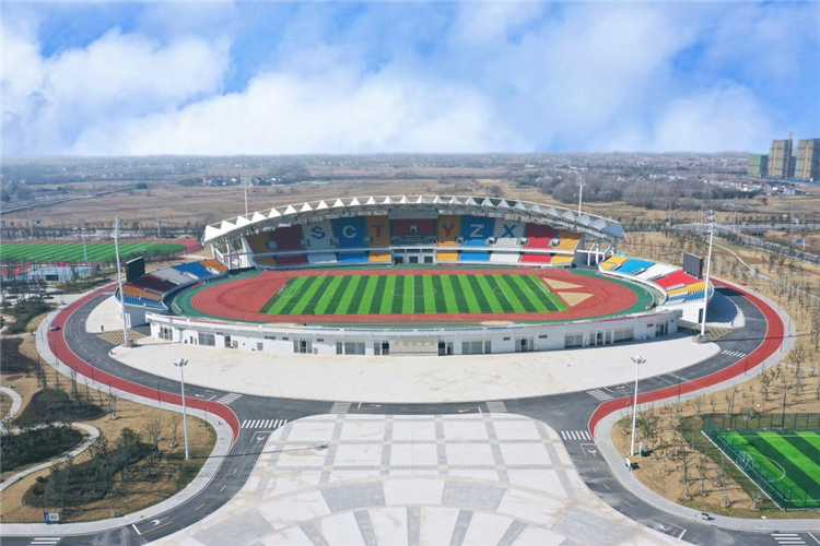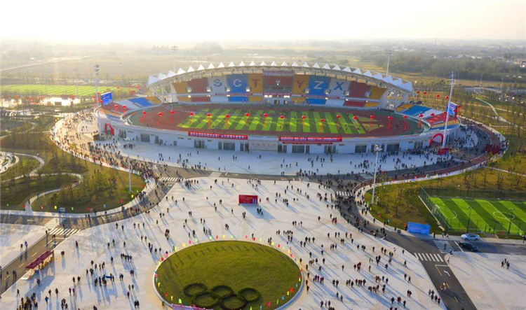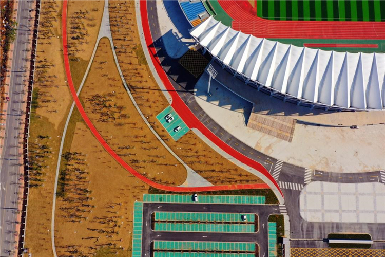 在無人機的鏡頭下,舒城體育中心全貌一覽無余,碧綠的草坪被深紅色跑道、五彩的體育場座椅環繞,色澤鮮艷、氣勢宏偉。