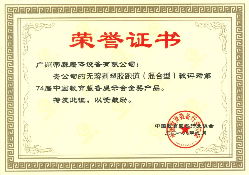 2018年廣州帝森(DISEN)“無溶劑塑膠跑道(混合型)”被第74屆中國教育裝備展示會金獎產品。