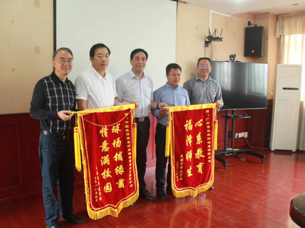 由中國教育裝備行業協會學校體育裝備分會組織,廣州帝森康體設備有限公司向中國教育發展基金會捐建四川省成都市華建學校籃球場地,校方為捐建企業廣州帝森贈送錦旗致謝。