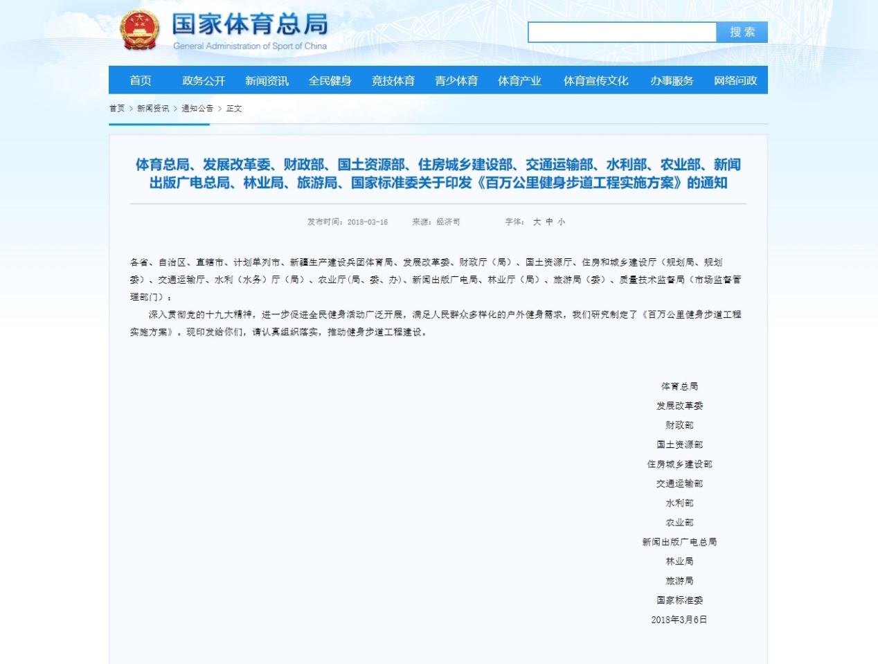 國家體育總局印發《百萬公里健身步道工程實施方案》
