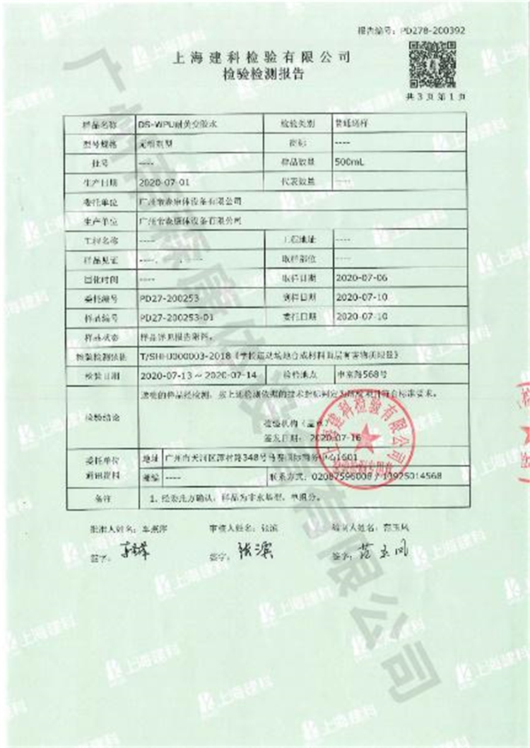 經過檢測認定,廣州帝森DISEN耐黃變膠水憑借過硬的產品質量,通過了上海團標T/SHHJ000003-2018《學校運動場地合成材料面層有害物質限量》,驗證了產品所具備的高品質,也反映了廣州帝森DISEN在運動地面材料綠色、環保、安全性能方面的嚴格要求。