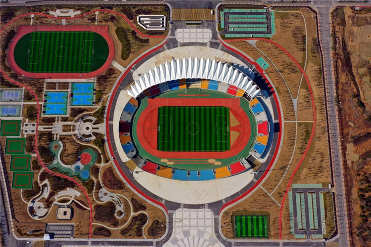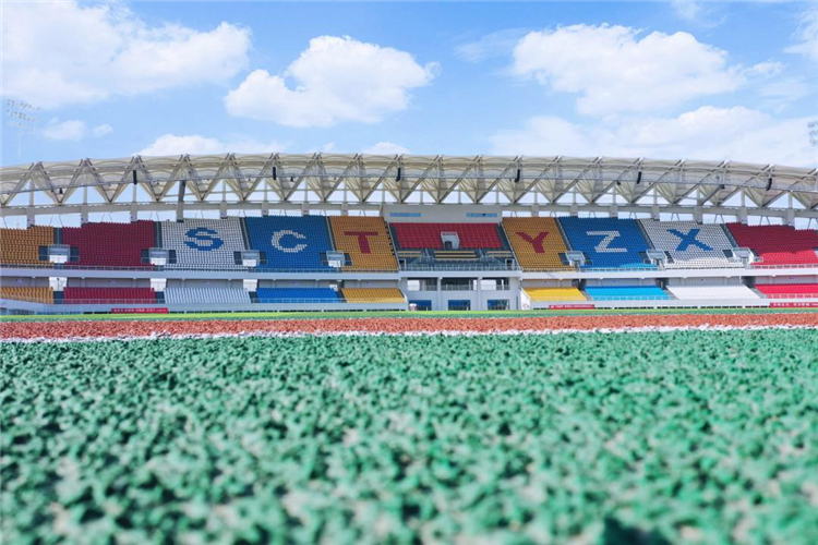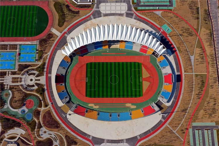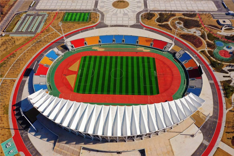 在無人機的鏡頭下,舒城體育中心全貌一覽無余,碧綠的草坪被深紅色跑道、五彩的體育場座椅環繞,色澤鮮艷、氣勢宏偉。