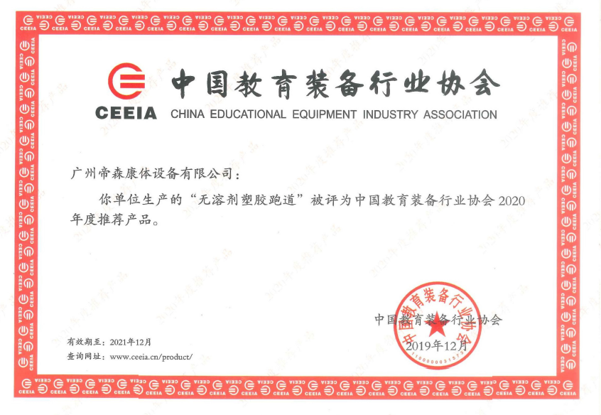 廣州帝森康體設備有限公司自2002年成立以來,一直秉承質量為首的經營理念,致力于為公眾創造更優質、更安全的運動場地和材料,得到政府、社會、業界的認可。2020年“廣州帝森(DISEN)”生產的“無溶劑塑膠跑道”系列被評為中國教育裝備行業協會2020年度推薦產品。